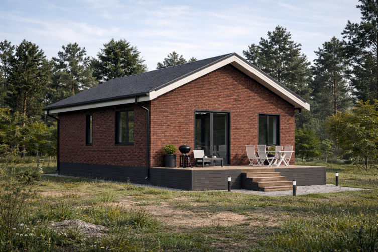 Компактный дом, есть все необходимое: две спальных комнаты, просторная кухня с зоной ТВ, сан.узел и гардеробная. Терраса 17.5 м.кв.