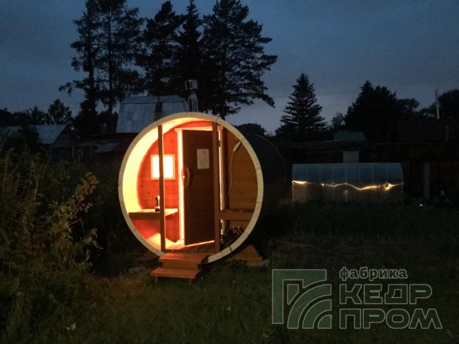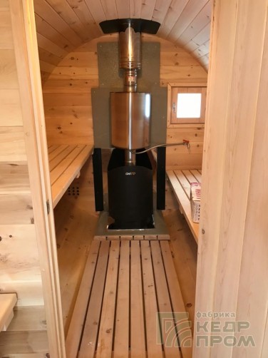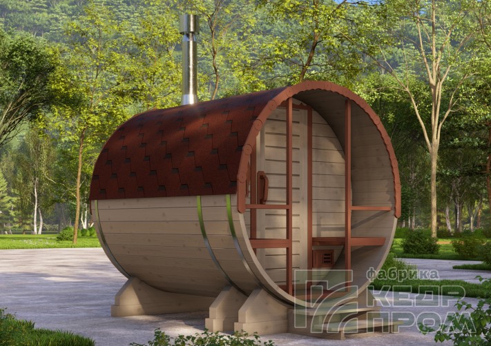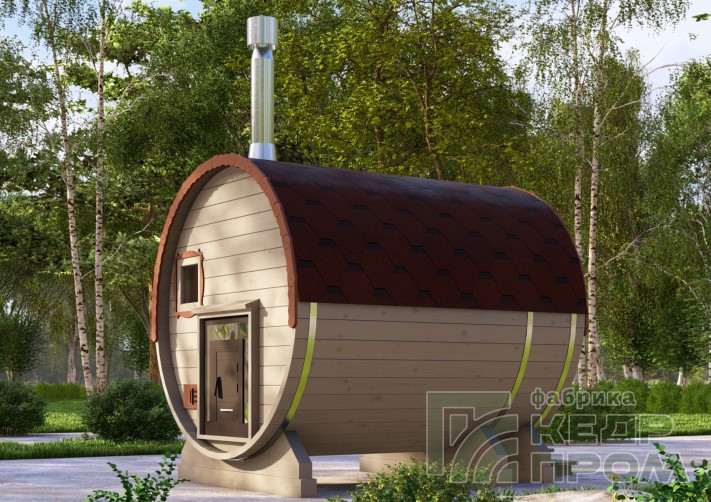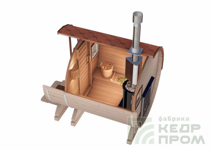 Компактная баня-бочка длиной 2,5 метра. Данная модель мобильной бани имеет в своей конструкции крылечко, которое станет прекрасным местом для отдыха после посещения парной, и защит Вас от дождливой погоды. Так же в комплекте размещены два удобных сидения.