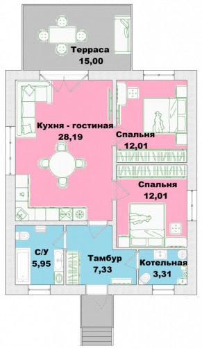 Новый проект компактного жилья по очень привлекательной цене. Заходя в дом мы попадаем в просторный тамбур площадью 7.33 кв.м. оборудованный нишами для расположения встроенной мебели, из которого можно пройти в котельную (3,31 кв.м), санузел (5,95 кв.м.) или кухню — гостиную площадью 28.19 кв.м. с выходом на террасу. Проектом предусмотрены две спальни правильной геометрической формы площадью по 12 кв.м. Если у Вас большая семья, мы можем предложить альтернативное решение этого проекта с ТРЕМЯ спальными комнатами. Для тех, кто занимается заготовкой ягод, овощей и фруктов на зиму в каждом проекте предусмотрена возможность сооружения овощехранилища или винного погреба с выходом из помещения котельной.